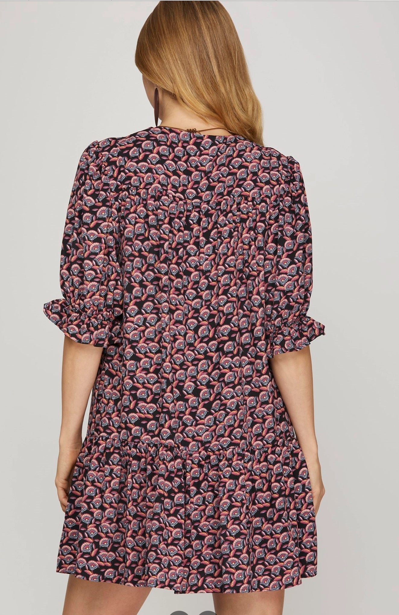 Bring effortless charm to your wardrobe with this bohemian-inspired tiered mini dress. Featuring a unique geometric floral print in warm earthy tones, this dress is the perfect blend of comfort and style. The split neckline with intricate embroidered detailing adds a touch of elegance, while the 3/4 sleeves with ruffle trim create a soft, feminine look. Its relaxed silhouette makes it easy to wear for casual days out, brunch dates, or styled up with boots and accessories for a chic evening vibe.