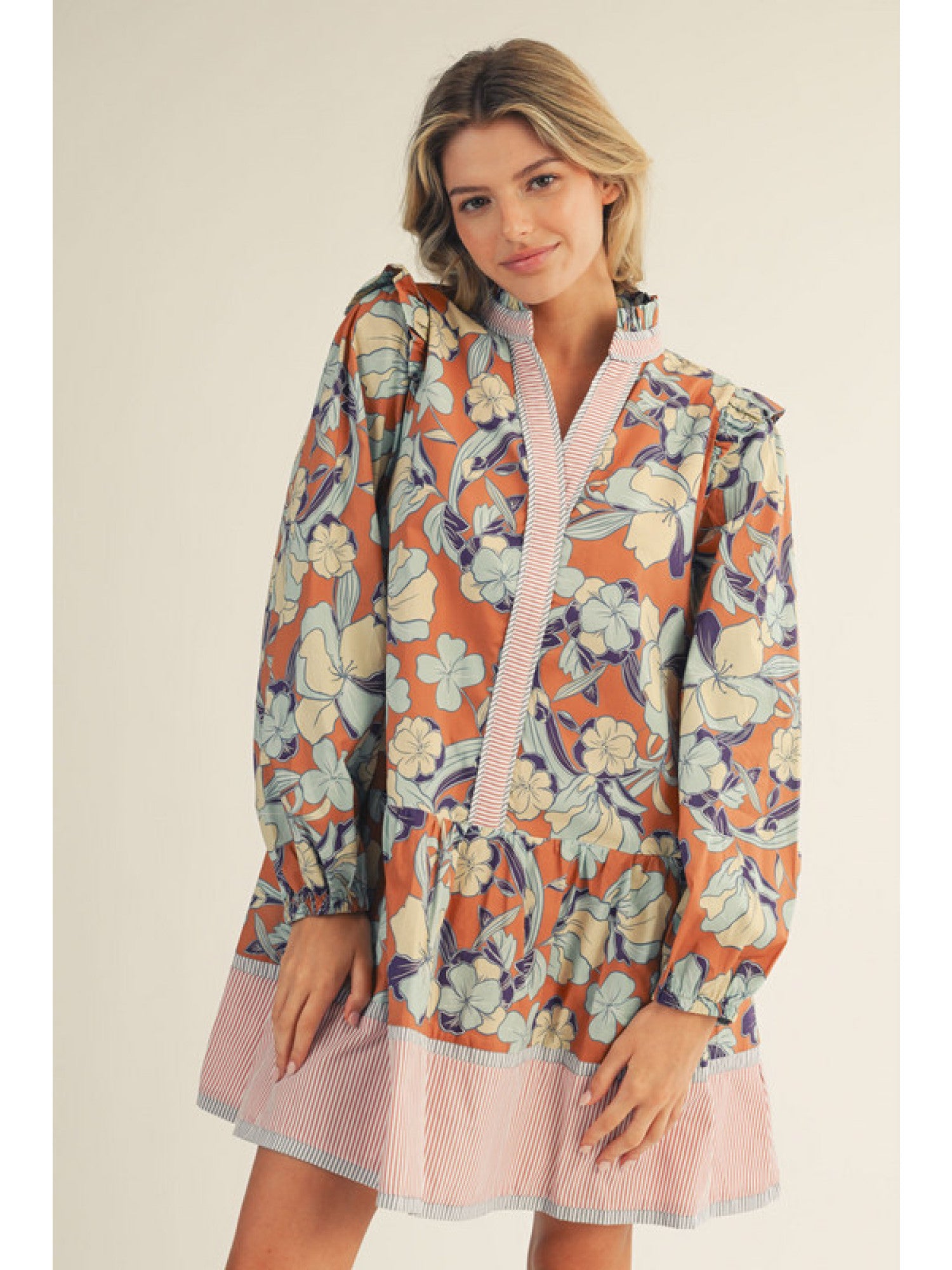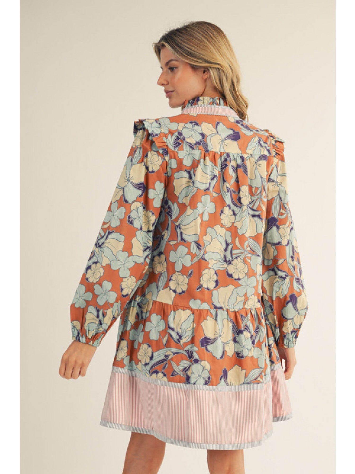 Make a statement with this vibrant floral mini dress that blends playful charm with everyday ease. Designed with a bold orange backdrop and soft pastel blooms, it’s finished with contrast striped details along the neckline, cuffs, and hem for a modern twist. The ruffle-trimmed collar and gathered skirt add a feminine touch, while the relaxed fit keeps it comfortable from day to night.