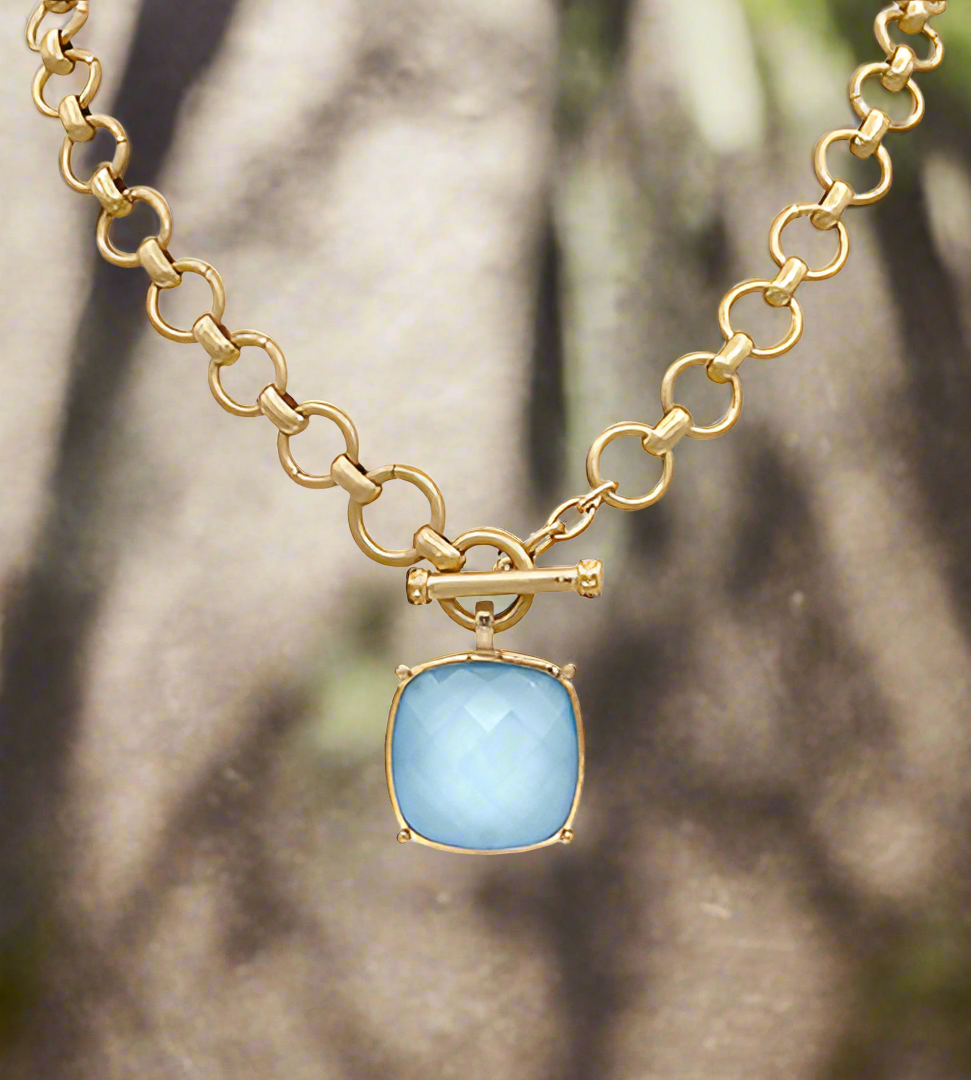 Add a pop of color with this gold chain necklace featuring a vibrant Fusha gemstone pendant. The faceted design catches the light beautifully, making it the perfect standout accessory for day or night.