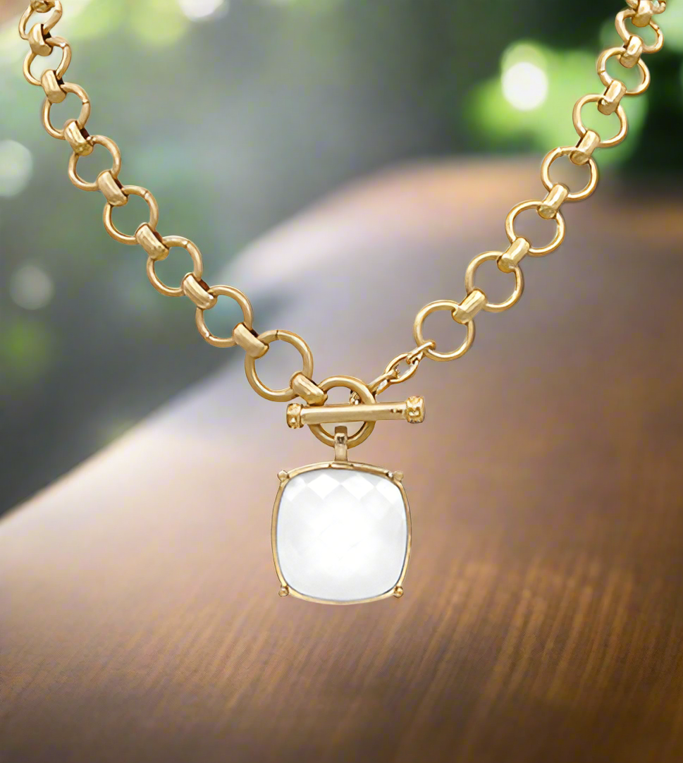 Add a pop of color with this gold chain necklace featuring a vibrant white gemstone pendant. The faceted design catches the light beautifully, making it the perfect standout accessory for day or night.