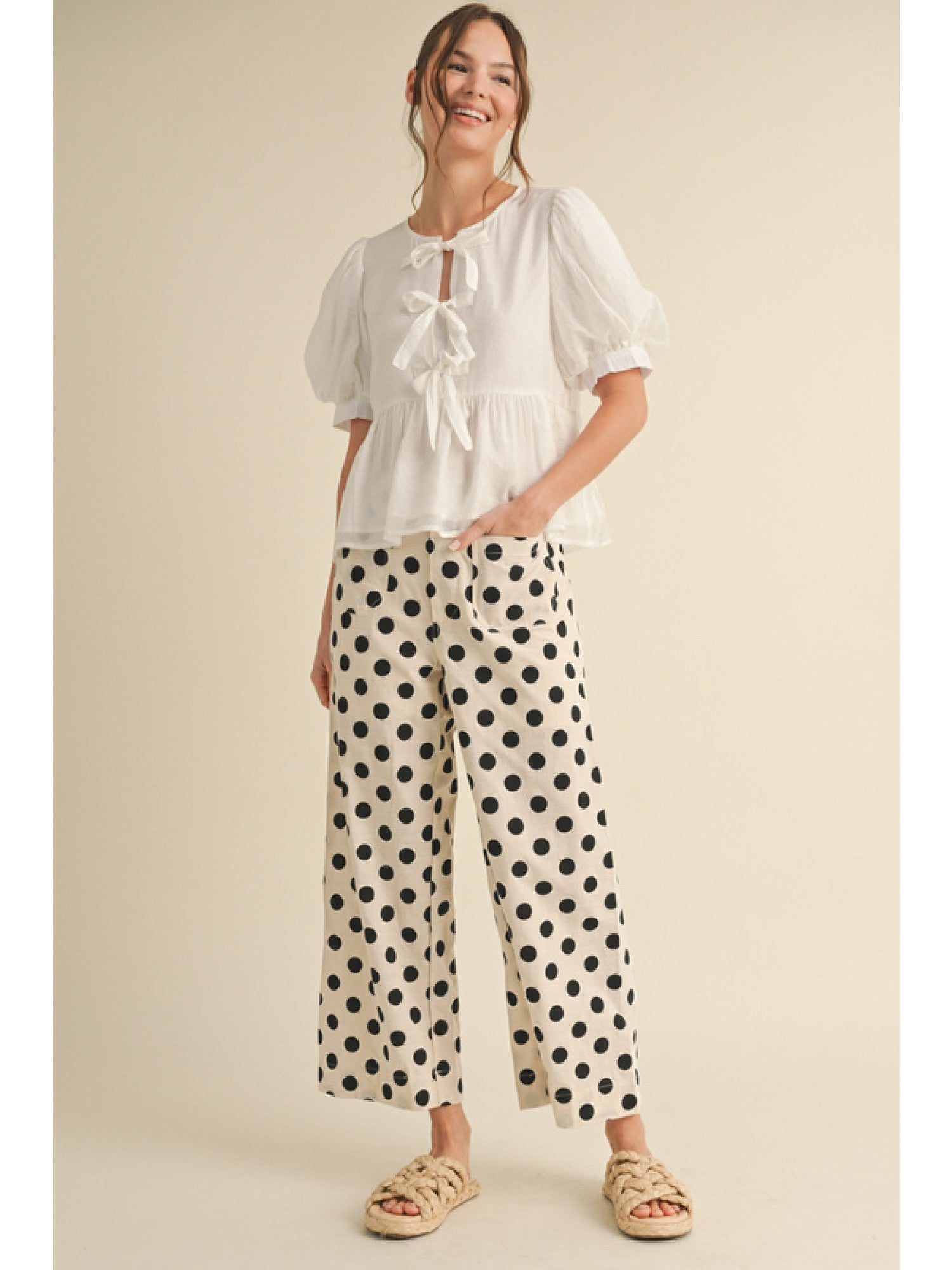 These playful black-and-white polka dot pants fuse timeless charm with a fresh, breezy vibe. Featuring a flattering high rise and wide-leg cut, they offer comfort without sacrificing style. Perfect for pairing with a crisp white blouse or a sleek tank, they create an effortlessly chic look that speaks volumes without saying a word.