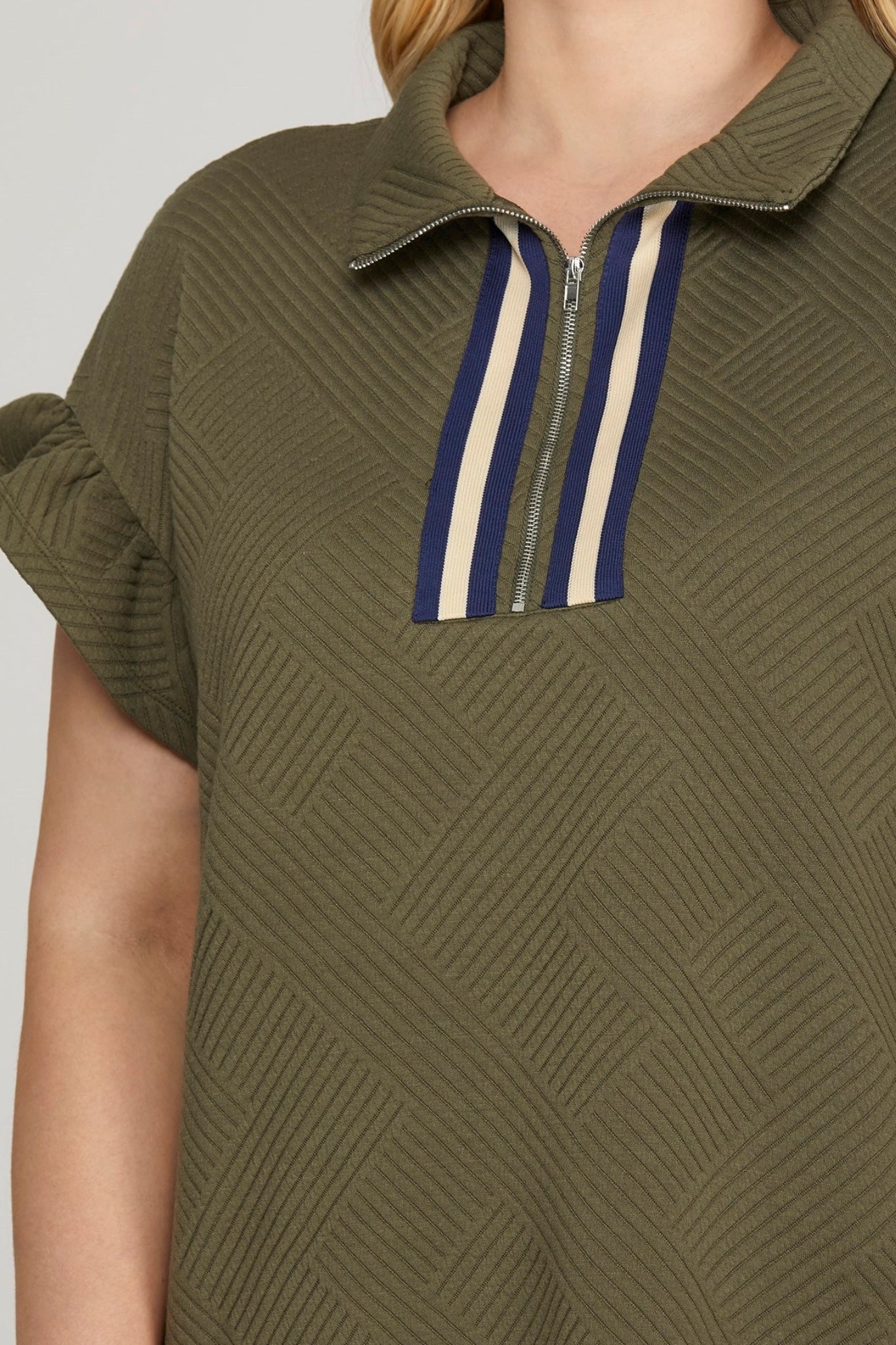 This olive plus size quilted mini dress boasts a half zip closure and ruffle sleeves for a stylish touch. Complete with practical pockets, this dress offers both fashion and functionality. Stay comfortable and chic in this versatile piece.