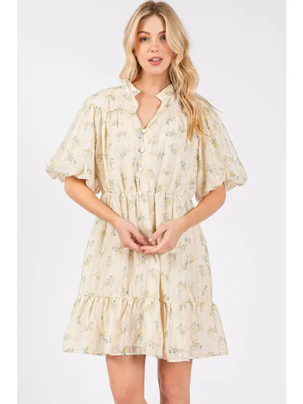 Fresh, feminine, and oh-so-charming—this yellow floral mini dress is a wardrobe must-have. Designed with a flattering V-neckline, puff sleeves, and a tiered hem, it creates a soft, flowy silhouette perfect for any occasion. Whether you’re headed to brunch, a picnic, or a sunny day out, this dress is a go-to for effortless style.